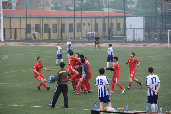 比賽開場(chǎng)不久,惡劣的天氣和球員的狀態(tài)不佳就讓我方遭到了懲罰,對(duì)方遠(yuǎn)射,門將李釗不敢怠慢,奮力撲出第一點(diǎn),無(wú)奈對(duì)方前鋒跟進(jìn)補(bǔ)射得分。此后我方便開始奮力反撲,但始終不能攻破對(duì)手城池。第二節(jié),國(guó)貿(mào)聯(lián)隊(duì)的經(jīng)驗(yàn)優(yōu)勢(shì)得以凸顯,他們站樁式的防守和不緊不慢的傳控,導(dǎo)致我方很長(zhǎng)一段時(shí)間無(wú)法組織有效的進(jìn)攻,加上我方隊(duì)員急躁的情緒,場(chǎng)面一度失控。休息時(shí)間全隊(duì)聚集討論,決定奮力一搏,隊(duì)長(zhǎng)方波帶傷上陣,加強(qiáng)進(jìn)攻。人員調(diào)整后,我方士氣明顯提升,經(jīng)過(guò)幾輪的組織,終于由徐學(xué)峰右路突破下底傳中,前點(diǎn)潘永博巧妙一漏,侯立峰左腳冷靜推射破門。一鼓作氣,方波角球精確助攻,對(duì)方中后衛(wèi)冒頂,侯立峰后點(diǎn)頭球再下一城。緊接著潘永博突破打門,對(duì)方門將脫手,方波跟進(jìn)冒著左腿再次拉傷的危險(xiǎn),奮力將球打進(jìn),3:1鎖定勝局,全體隊(duì)員緊緊的擁抱在一起,場(chǎng)下啦啦隊(duì)也情緒高漲,擊鼓吶喊為安糧健兒加油。