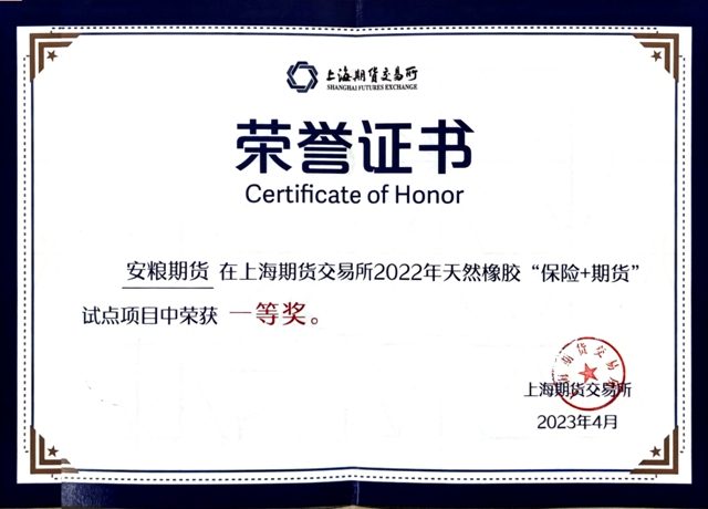 近日,上海期貨交易所對2022年天然橡膠“保險+期貨”試點項目進行結項評審,安糧期貨在海南省樂東黎族自治縣開展的“保險+期貨”項目中表現(xiàn)優(yōu)異,榮獲2022年天然橡膠“保險+期貨”試點項目一等獎。
