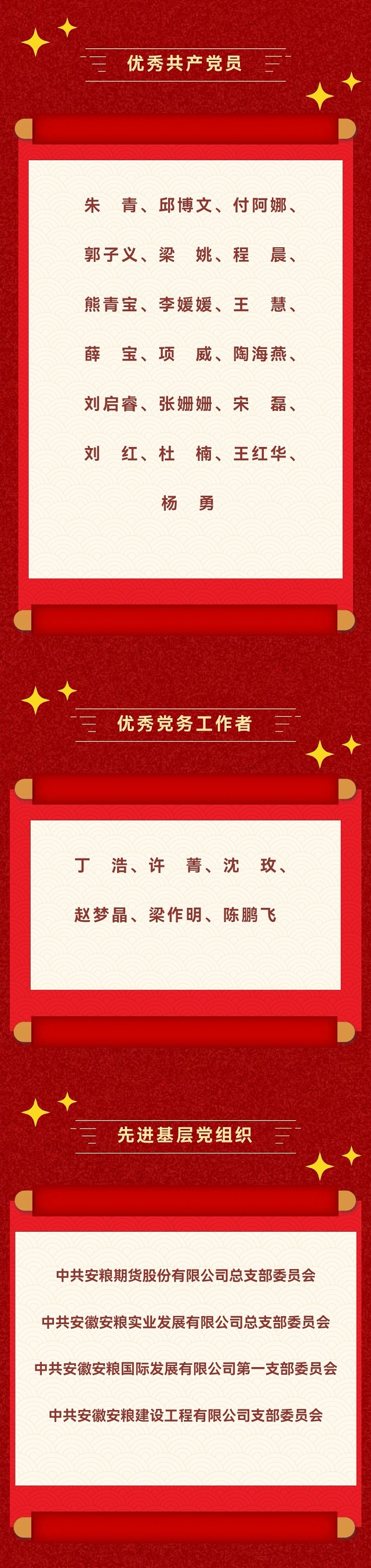 為大力弘揚(yáng)黨的優(yōu)良傳統(tǒng)和作風(fēng),激勵(lì)各級(jí)黨組織和廣大黨員更加深刻地領(lǐng)悟“兩個(gè)確立”的決定性意義,更加自覺增強(qiáng)“四個(gè)意識(shí)”、堅(jiān)定“四個(gè)自信”、做到“兩個(gè)維護(hù)”,努力營造見賢思齊、爭做先鋒的良好氛圍。近日,安徽國貿(mào)黨委對(duì)優(yōu)秀共產(chǎn)黨員、優(yōu)秀黨務(wù)工作者和先進(jìn)基層黨組織進(jìn)行了表彰,安糧集團(tuán)19名優(yōu)秀共產(chǎn)黨員、6名優(yōu)秀黨務(wù)工作者和4個(gè)先進(jìn)基層黨組織獲得榮譽(yù)。