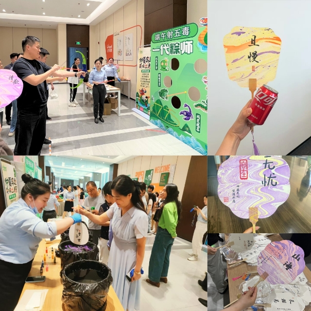 5月29日,在公司餐廳開展的“仲夏奔赴?美味出粽”端午趣味活動(dòng),吸引了眾多員工熱情參與。活動(dòng)現(xiàn)場(chǎng)最具人氣的“端午射五毒”游戲,參與者手持弓箭瞄準(zhǔn)背景板上的蛇、蝎等“五毒”圖案,在體驗(yàn)傳統(tǒng)民俗競(jìng)技樂趣的同時(shí),寄托驅(qū)邪避毒、祈福安康的心愿。同步開展的非遺漆扇制作活動(dòng)讓員工通過親手創(chuàng)作進(jìn)一步深化對(duì)非遺文化的認(rèn)知。成品扇子上,“山?!薄盁o憂”“且慢”等字樣與端午元素、傳統(tǒng)書法相映成趣。